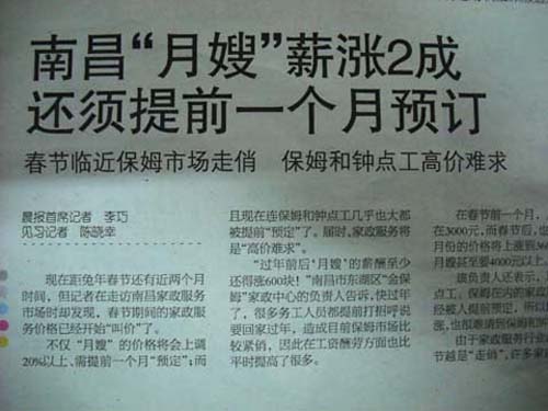 不僅“月嫂”的價(jià)格將會(huì)上調(diào)20%以上、需提前一個(gè)月“預(yù)訂”;而且現(xiàn)在連保姆和鐘點(diǎn)工幾乎也大都被提前“預(yù)訂”了。屆時(shí),家政服務(wù)將是“高價(jià)難求”。